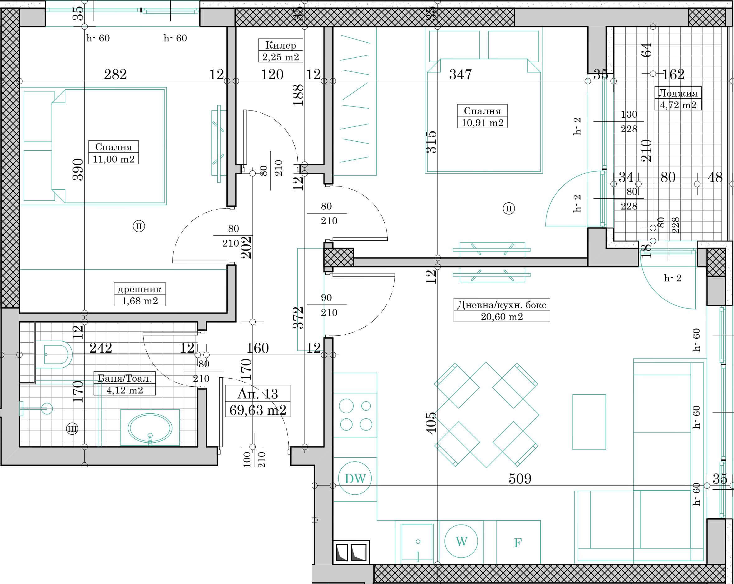 Апартамент №13 се състои от дневна с кухненски бокс, две спални, баня с тоалетна, дрешник, килер, коридор и лоджия.