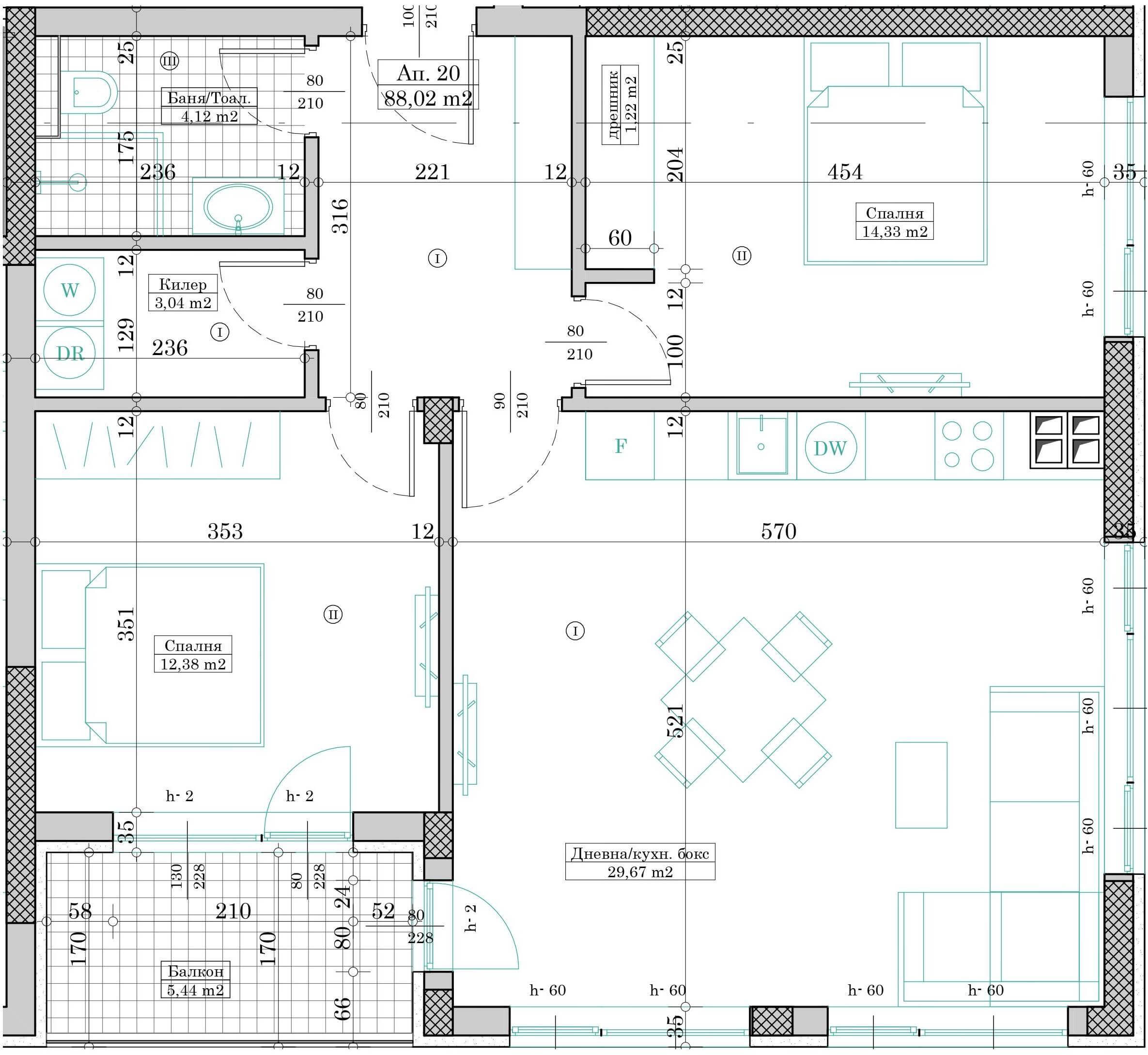 Апартамент №20 се състои от дневна с кухненски бокс, две спални, баня с тоалетна, дрешник, килер, коридор и балкон.