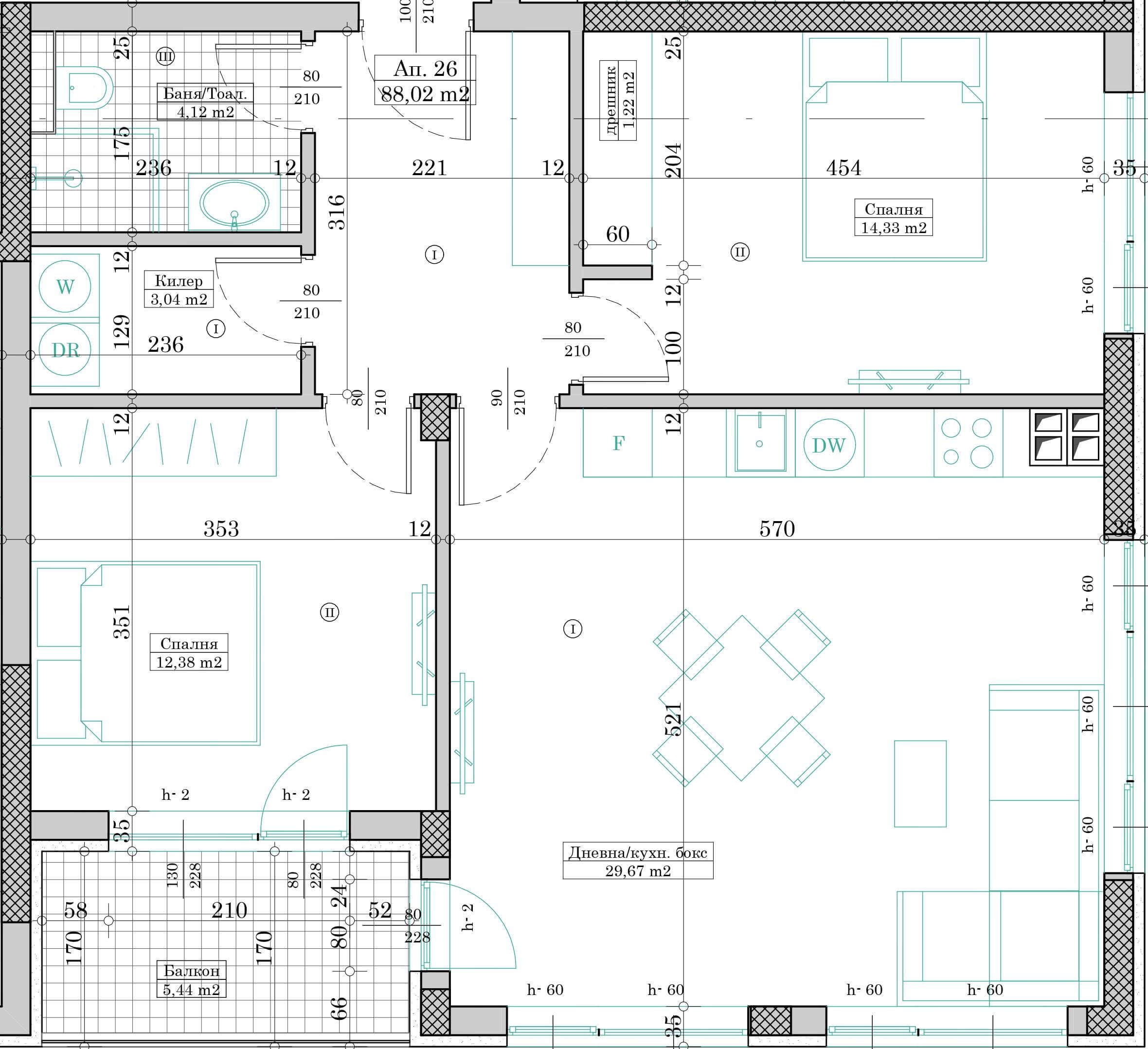 Апартамент №26 се състои от дневна с кухненски бокс, две спални, баня с тоалетна, дрешник, килер, коридор и балкон.