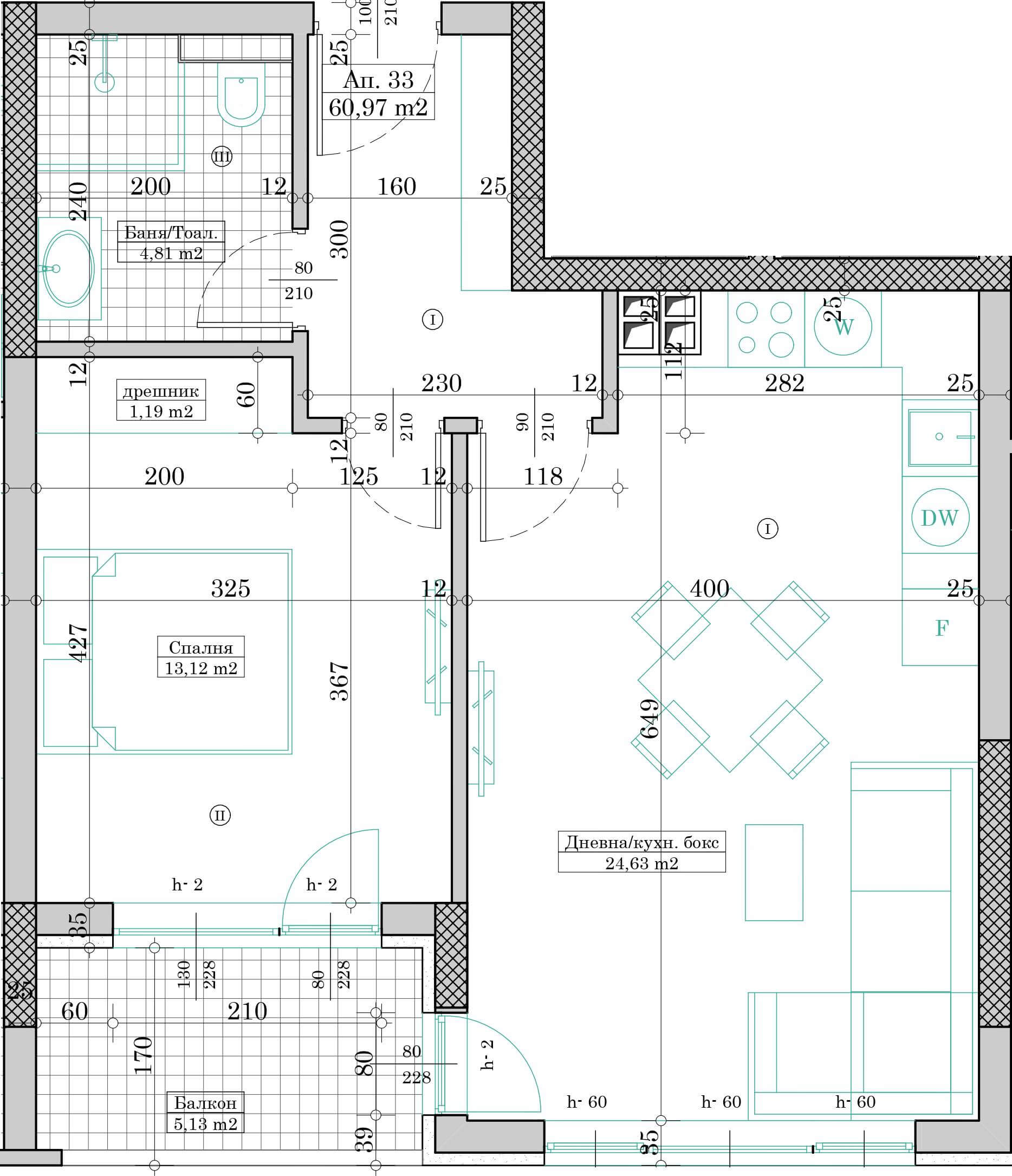 Апартамент №33 се състои от дневна с кухненски бокс, спалня, баня с тоалетна, дрешник, коридор и балкон.