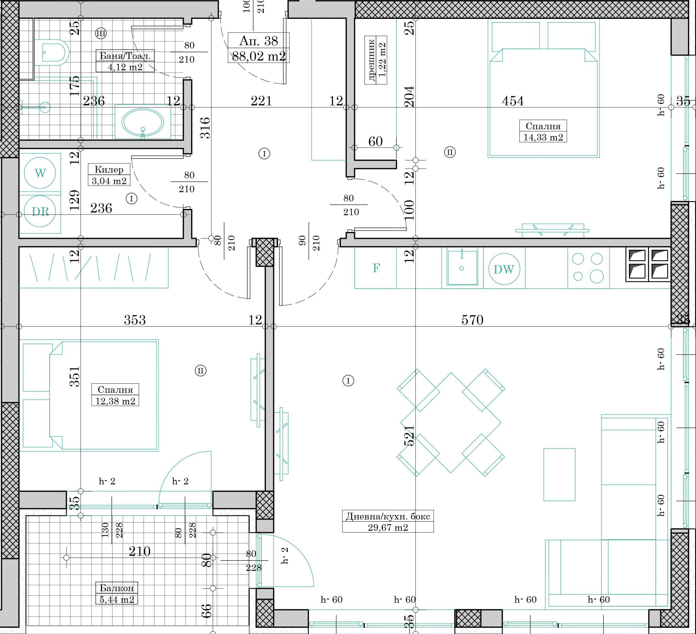 Апартамент №38 се състои от дневна с кухненски бокс, две спални, баня с тоалетна, дрешник, килер, коридор и балкон.