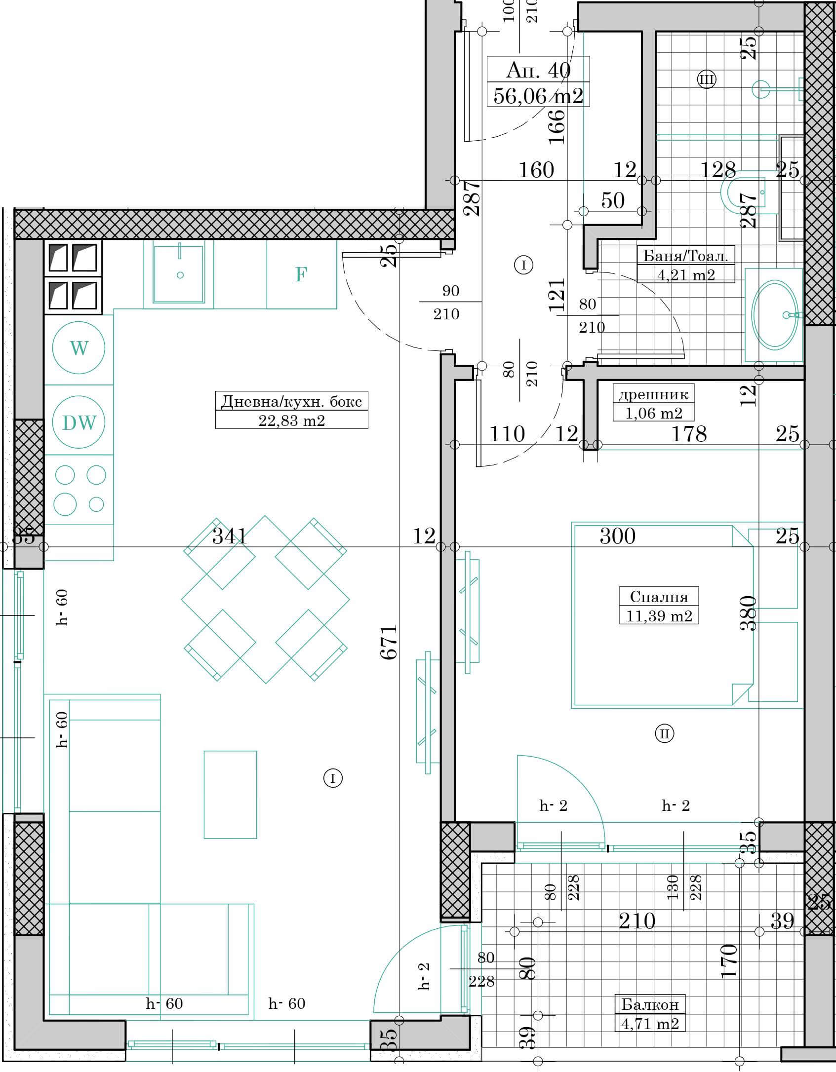 Апартамент №40 се състои от дневна с кухненски бокс, спалня, баня с тоалетна, дрешник, коридор и балкон.