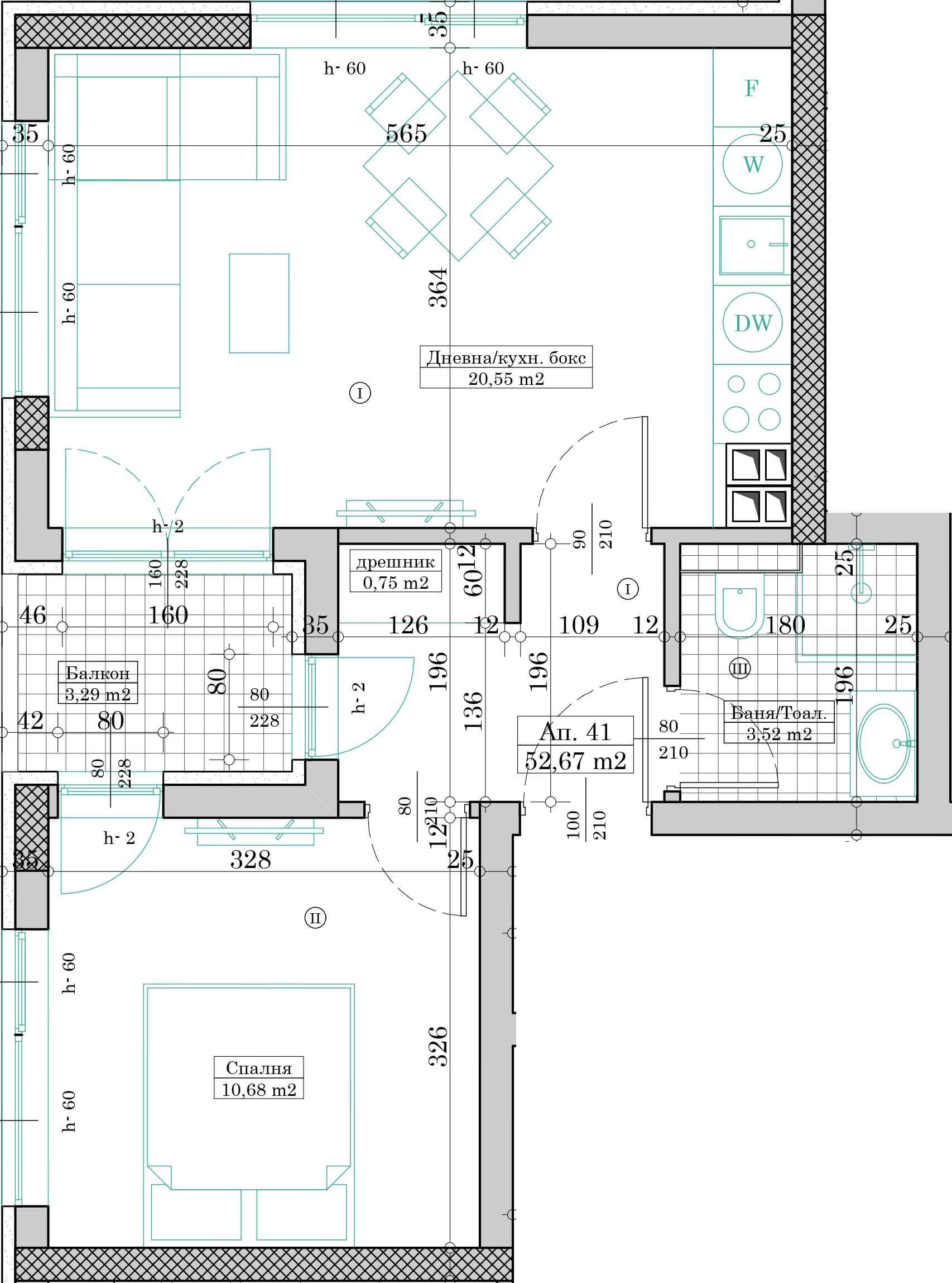Апартамент №41 се състои от дневна с кухненски бокс, спалня, баня с тоалетна, дрешник, коридор и балкон.