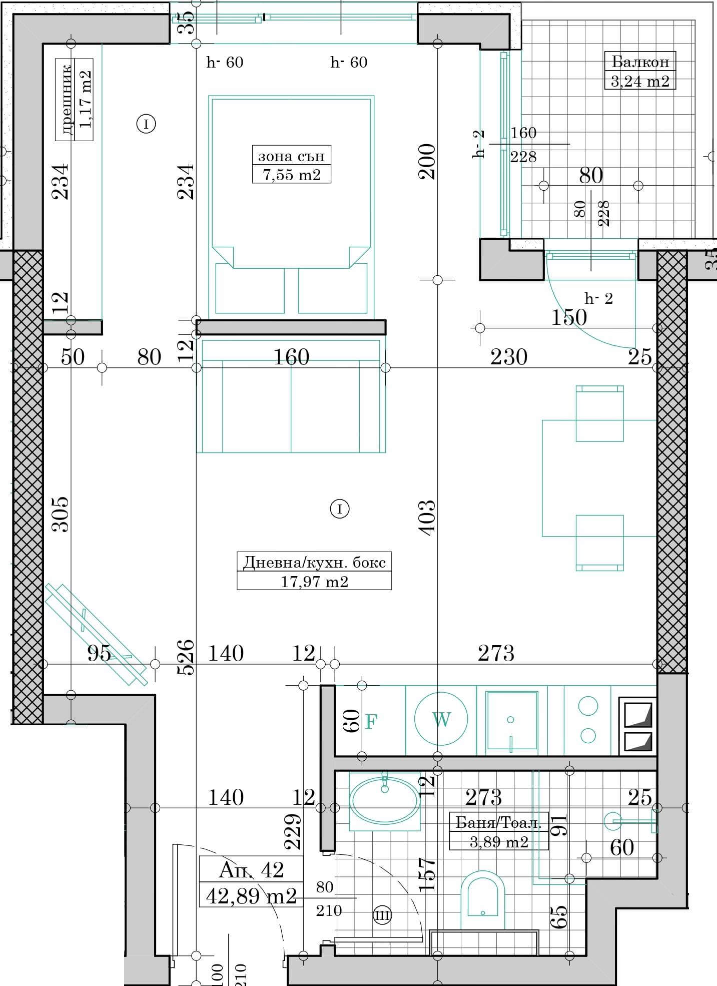 Апартамент №42 се състои от дневна с кухненски бокс, зона сън, баня с тоалетна, дрешник, коридор и балкон.