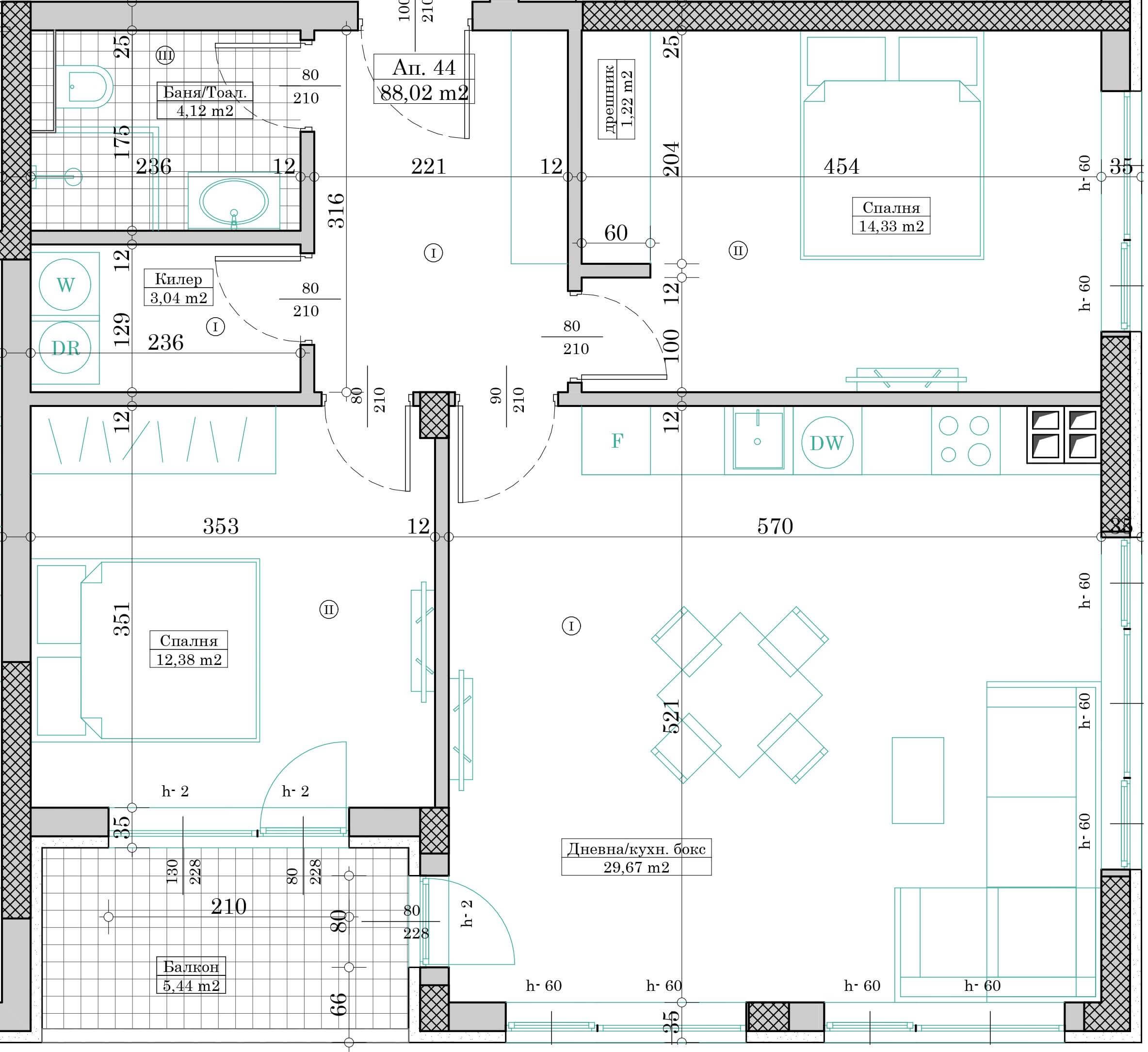 Апартамент №44 се състои от дневна с кухненски бокс, две спални, баня с тоалетна, дрешник, килер, коридор и балкон.