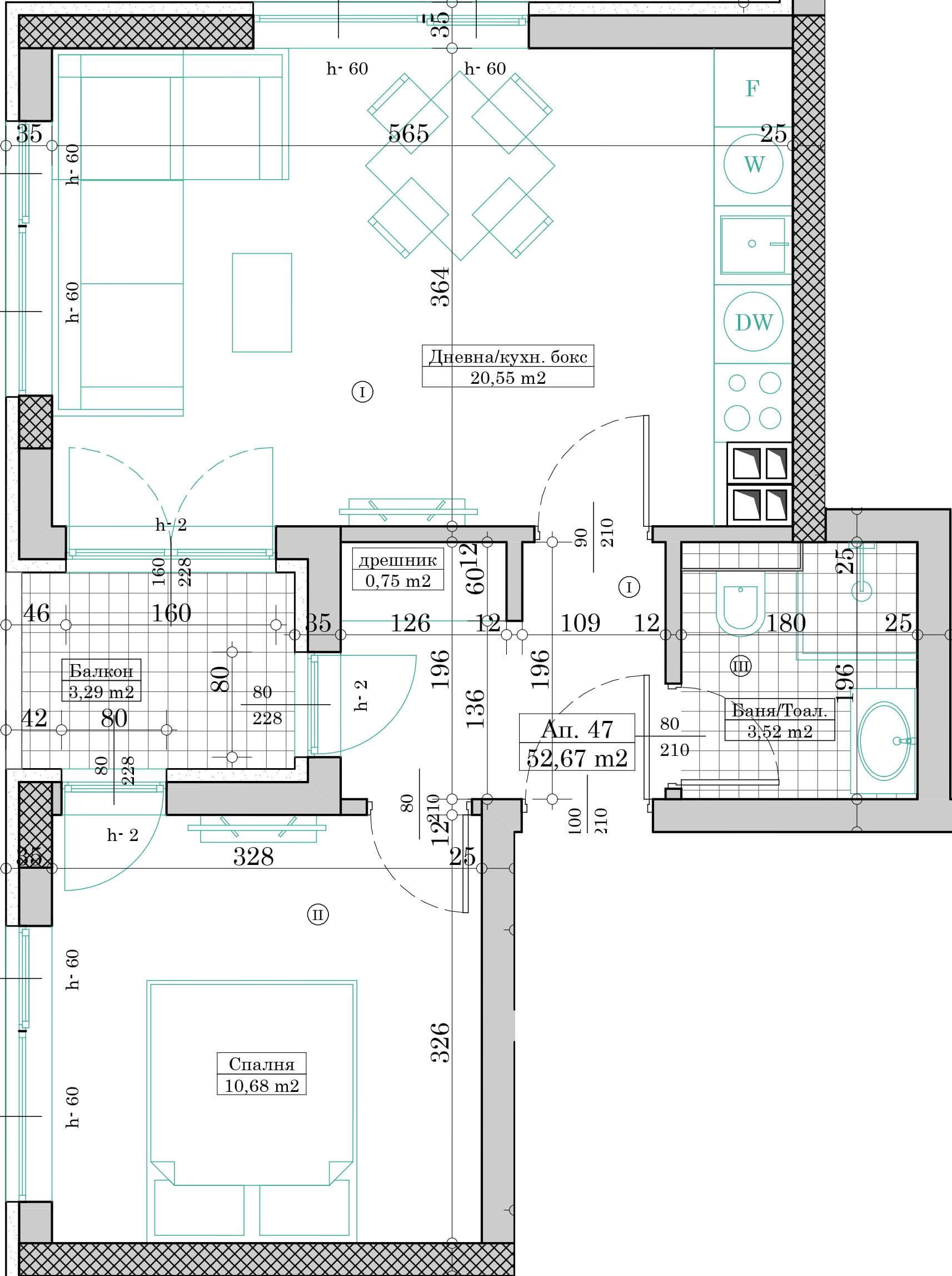 Апартамент №47 се състои от дневна с кухненски бокс, спалня, баня с тоалетна, дрешник, коридор и балкон.